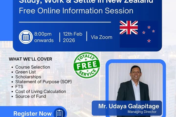 If you have a Bachelors, Master’s or a professional qualification you can go to New Zealand together with your family. We at Sage Consulting Services (Pvt) Ltd have over 16 years of experience guiding thousands of students achieve their PR dream. We invite you to join the Zoom meeting where you can…
