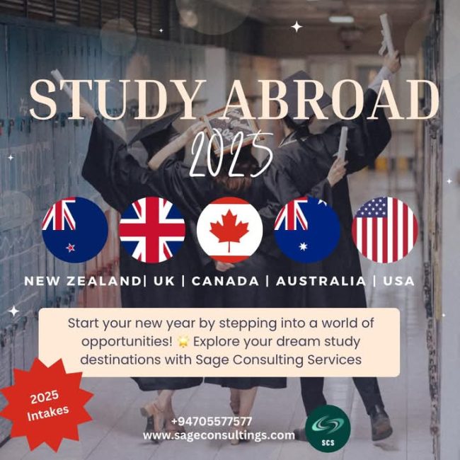 *Study Abroad with Sage Consulting Services! *   Explore new opportunities in New Zealand, Canada, Australia, UK and USA. Start your journey with trusted guidance and apply for the 2025 intakes today!   Ready to start your adventure? 🌟 Contact us at SAGE for personalized guidance and support on your study abroad journey. We are…