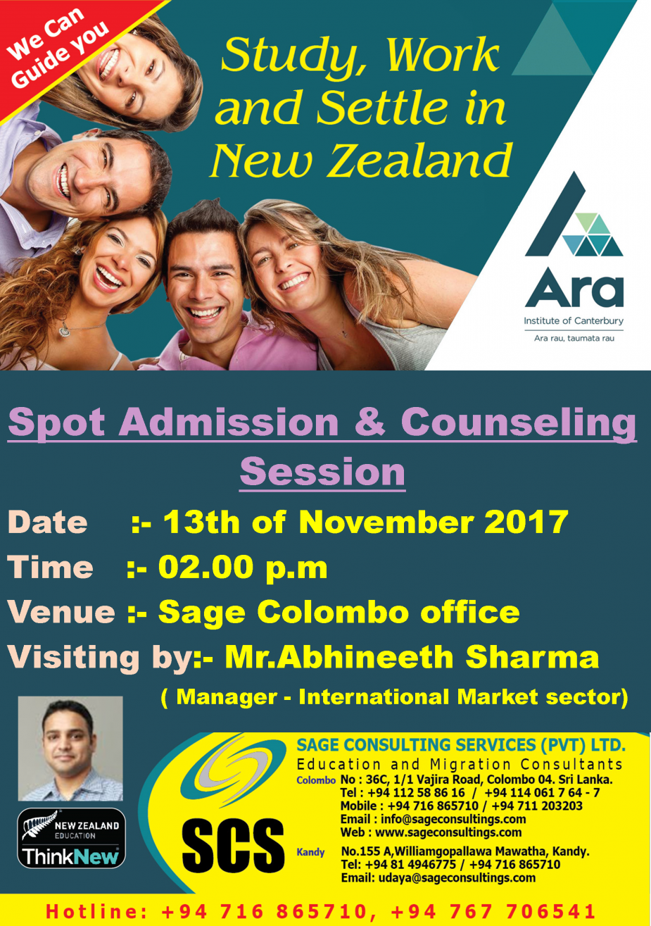 Spot Admission & Counselling Session with ACG Education – (Pathways Campus) Explore your future in NZ! Precenter – Mr.Ashish Suri Date – 20th December 2017 Time – 1.00 p.m to 3.00 p.m Place – Colombo Sage Office